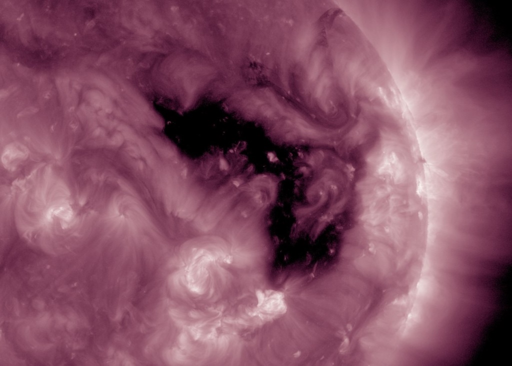 Как сообщает Лаборатория солнечной астрономии ИКИ и ИСЗФ, корональная дыра хорошо различима на поступающих изображениях Солнца, где видно тёмную структуру размером около полумиллиона километров, занимающую значительную часть видимого солнечного диска. Корональные дыры таких размеров являются источником солнечного ветра высокой скорости.