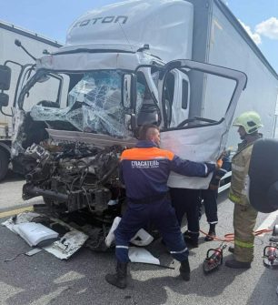 Водитель большегруза не выдержал безопасную дистанцию на трассе. Сегодня днем, на 1000-м км автодороги М-4 «Дон», большегрузный автомобиль столкнулся с иномаркой