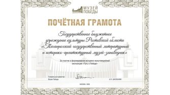 Знак благодарности передан за участие в формировании экспозиции «Путь к Победе». Почетная грамота Центрального музея Великой Отечественной войны (Музея Победы) в Москве