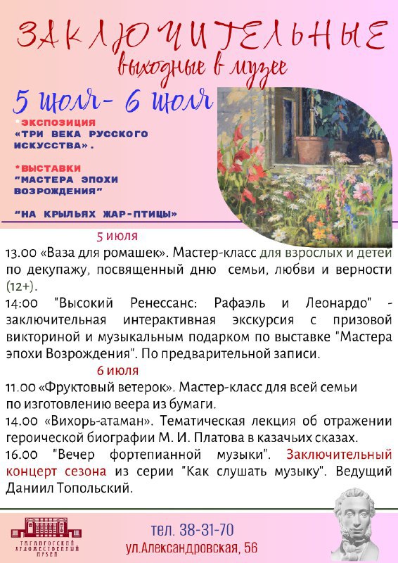 Гостей музея ждут экскурсии по экспозиции «Три века русского искусства» — ежедневно в 15.00, летние мастер-классы, интерактивная экскурсия по выставке «Мастера эпохи Возрождения» с музыкальным подарком, лекция о Матвее Платове.