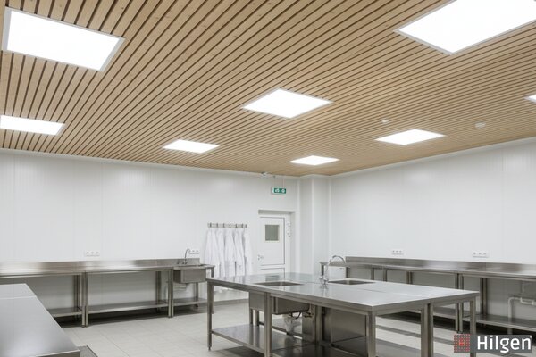 Для лабораторий, где проводятся работы с легковоспламеняющимися веществами, рекомендуется использовать негорючие материалы (класс НГ) — например, металлические реечные системы или панели из базальтового волокна.