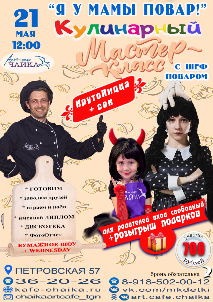 В воскресенье, 21 мая, в Арт-Кафе «Чайка» (ул. Петровская, 57) состоится кулинарный мастер-класс для детей «Я у мамы повар!» со студией праздника Анны Маняхиной. Начало в 12 часов.