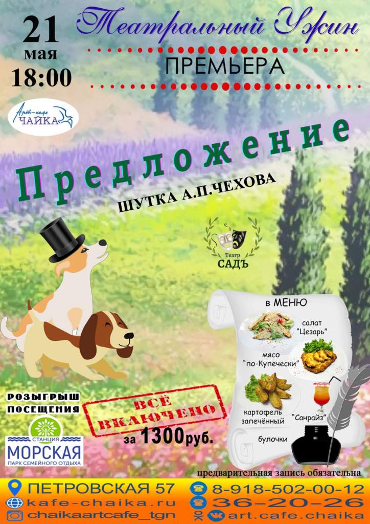 А вечером таганрожцев и гостей города приглашают на театральный ужин с премьерой спектакля «Предложение» (шутка в одном действии А.П.Чехова) в исполнении артистов театра-студии «СаД», руководитель Валентина Псёл. Начало в 18 часов.