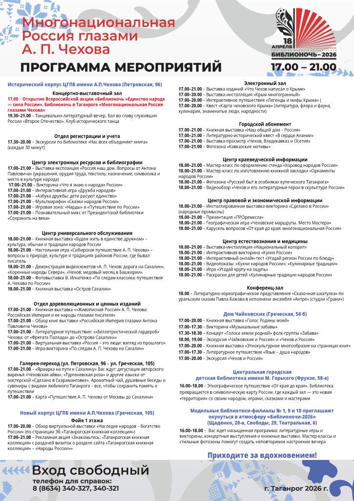 В субботу, 18 апреля, Таганрог присоединится к юбилейной, 15-й Всероссийской акции «Библионочь». В этом году она пройдет под девизом «Единство народа – сила России» и предложит гостям этнографический круиз по маршруту знаменитого земляка, от Москвы до Сахалина. Программа получила название «Многонациональная Россия глазами А.П. Чехова». Вход на все мероприятия свободный.
