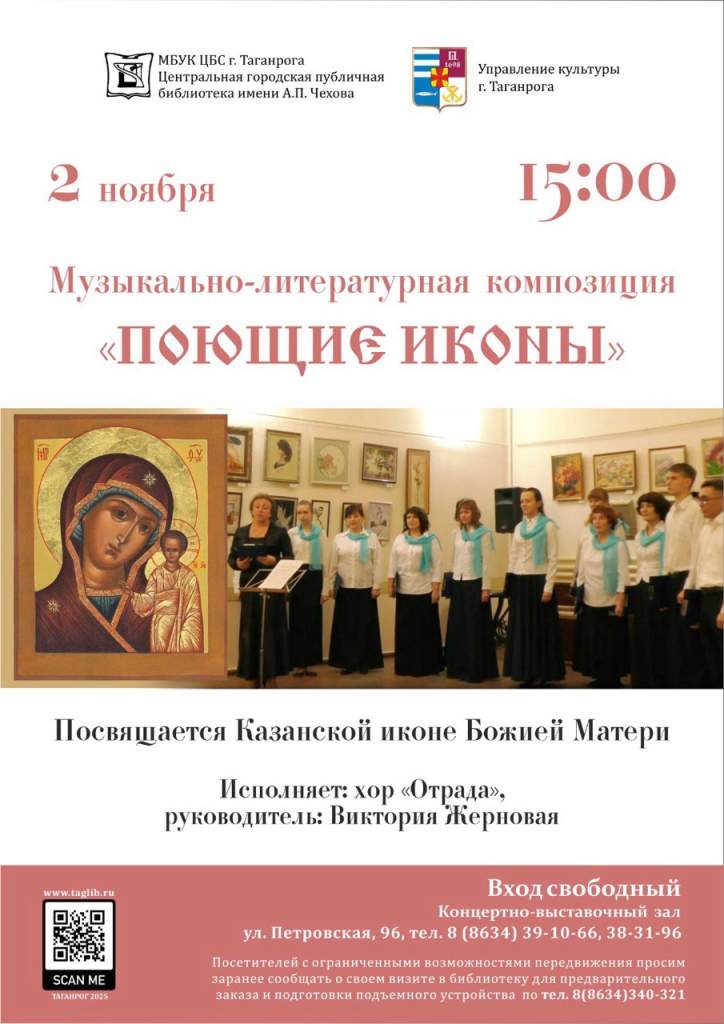 2 ноября в Таганроге в концертно-выставочном зале Центральной городской публичной библиотеки имени А.П. Чехова хор «Отрада» (руководитель — Виктория Жерновая) представит музыкально-литературную композицию «Поющие иконы».