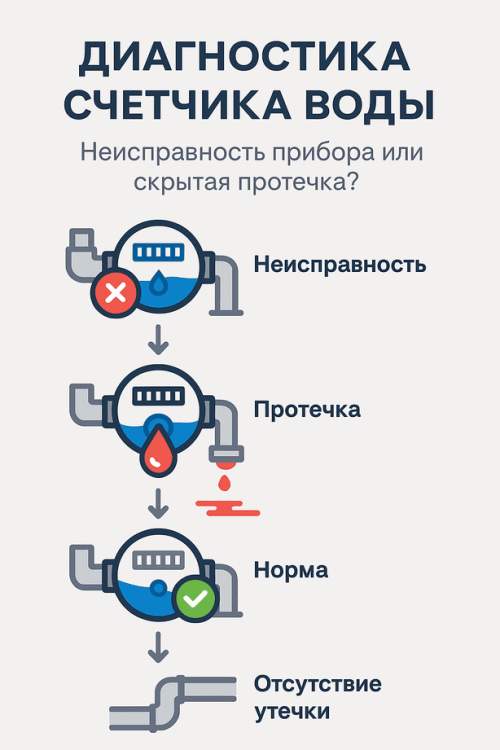 Следует отметить важную диагностическую особенность: если при большом расходе воды (наполнение ванны, работа стиральной машины) счетчик работает корректно, а завышение происходит в режиме малых потоков — проблема не в самом приборе, а в скрытых протечках. Микротрещины в трубах, подтекающая арматура бачка унитаза или неплотности соединений заставляют крыльчатку вращаться круглосуточно, создавая иллюзию неисправности счетчика.