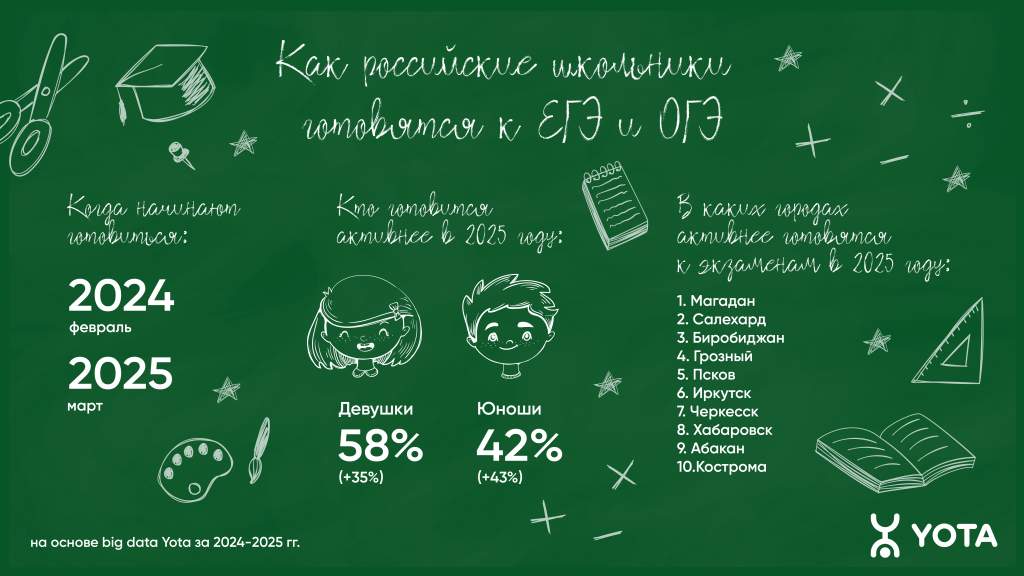 Активная подготовка к ЕГЭ и ОГЭ у российских школьников в 2025 году сдвинулась на март. При этом все больше учеников готовятся онлайн — число пользователей сервисов и приложений для подготовки к обязательным экзаменам с января по первые две недели мая выросло на 39% относительно прошлого года, выяснили аналитики Yota на основе обезличенных данных абонентов.