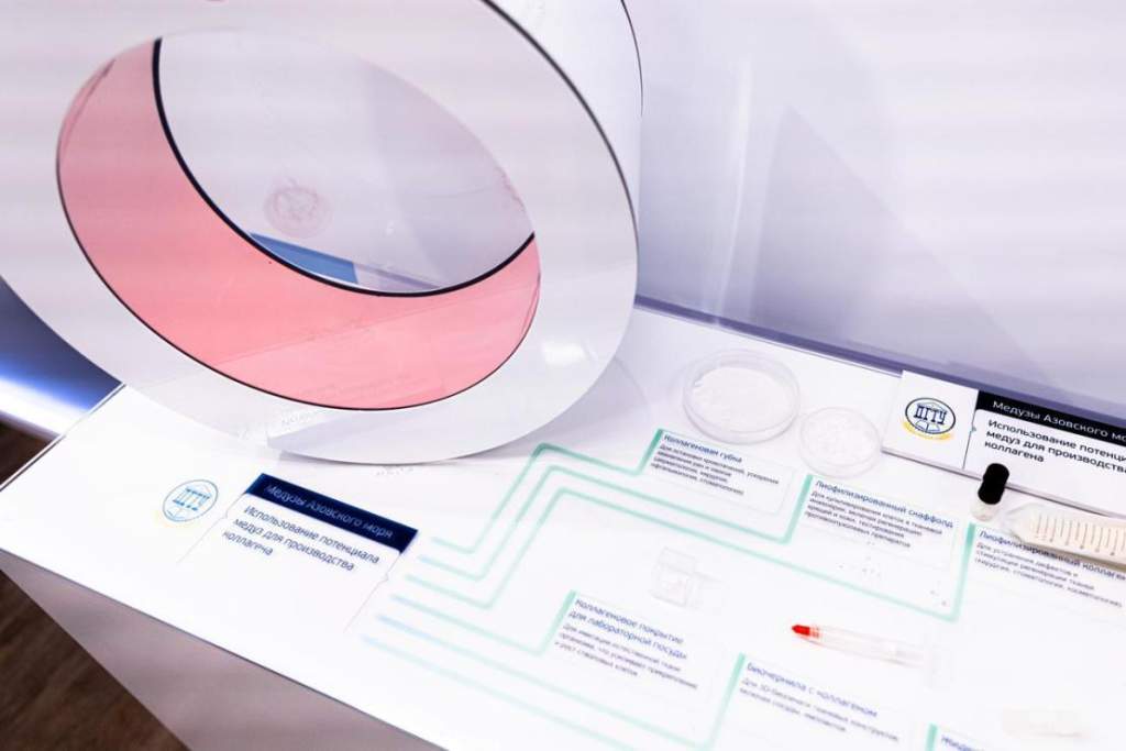 На стенде «Национальная экологическая и климатическая инициатива» глава ДНР Денис Пушилин сообщил Президенту РФ, что формируемый на базе АСИ научно-технологический задел ускорит достижение целей Стратегии развития Приазовья до 2040 года. В качестве примера был продемонстрирован проект ДГТУ. Потенциал вылова медуз оценивается примерно в миллион тонн в год, а мировой рынок коллагена, по прогнозам, вырастет с 4,7 млрд долларов в 2020 году до 10 млрд долларов к 2030 году.