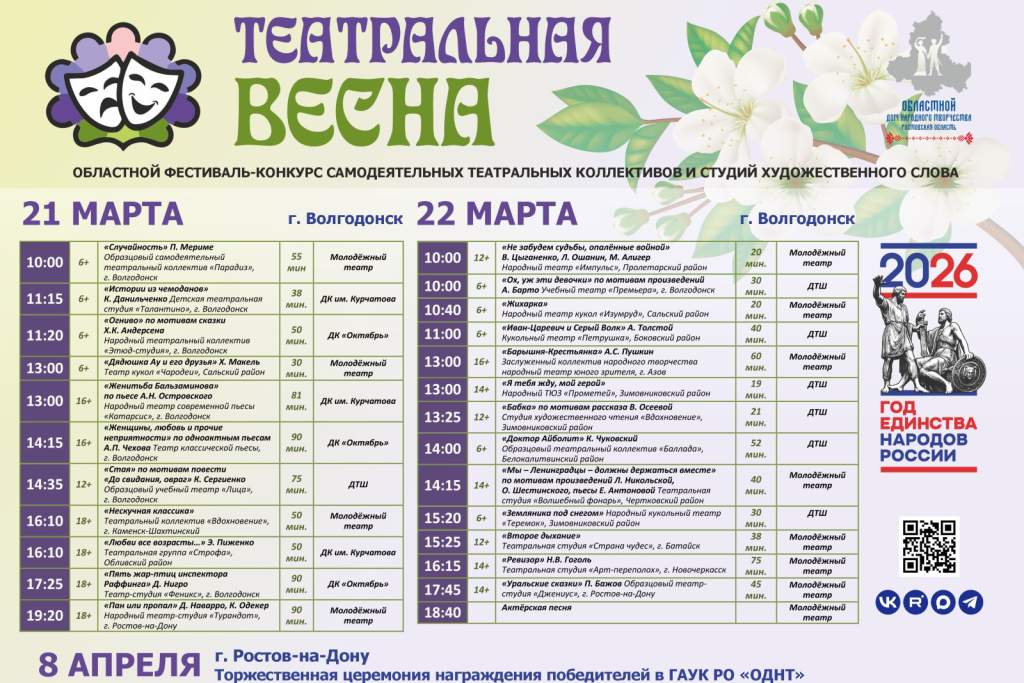 С 14 по 28 марта в Ростовской области проходит ежегодный областной фестиваль-конкурс самодеятельных театральных коллективов и студий художественного слова «Театральная весна». В этом году конкурсные показы пройдут на трех ключевых площадках. В первом показе, который уже состоялся на сцене Шахтинского драматического театра, приняли участие 14 коллективов из десяти муниципалитетов – Азовского, Аксайского, Константиновского, Матвеево-Курганского, Мясниковского районов, а также Ростова-на-Дону, Новочеркасска, Шахт, Новошахтинска и Таганрога.