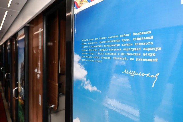 «Интерьеры вагонов украшены цитатами Шолохова и пейзажами Дона, а под звуки песни «Ростов-город, Ростов-Дон» поезд начинает и завершает свой путь», — говорится в сообщении.