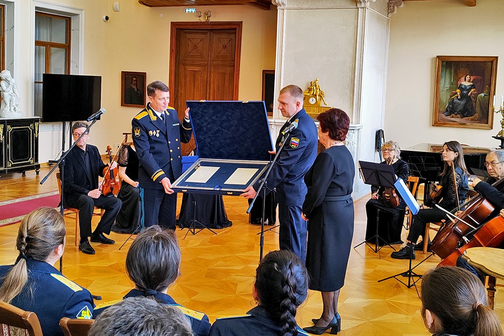 Директор Таганрогского музея-заповедника Елизавета Липовенко поблагодарила гостей за ценный дар. В свою очередь, заместитель председателя Городской Думы Таганрога Валерий Селиванов поприветствовал представителей ФССП от имени депутатского корпуса. В память о визите Елизавета Липовенко вручила Евгению Казанову альбом-каталог «Петр I и его эпоха». Завершила мероприятие музыкальная программа в исполнении муниципального Камерного оркестра Таганрога под управлением Игоря Тронова.