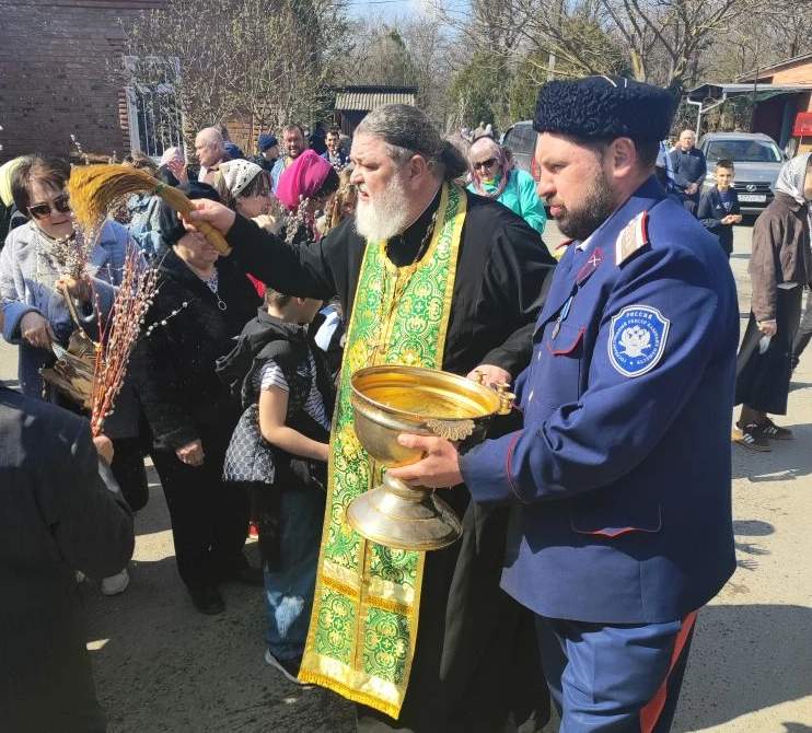 В ночь с 11 на 12 апреля казаки с семьями во главе с атаманом городского казачьего общества, войсковым старшиной Иваном Надолинским присоединились к торжественной Пасхальной службе и крестному ходу в храме Всех Святых Таганрогского Благочиния. Настоятель храма, отец Игорь, духовный наставник казаков, поздравил их с праздником и благословил на дальнейшее служение городу, Дону и Отечеству.