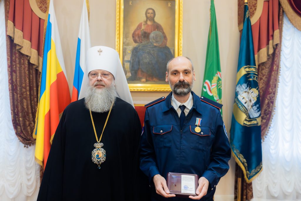 Глава Донской митрополии вручил помощнику атамана ГКО «Таганрогское» по вопросам взаимодействия с Таганрогским благочинием Александру Юрченко медаль священномученика Николая Попова за труды в деле прославления праведного Иоанна Домовского.