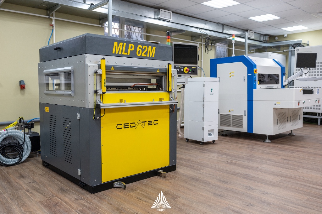 Ещё один центр дивизиона «Приборы, комплексы и системы» ПИШ ЮФУ, который посетила делегация, оборудован лазерной 355 нм установкой, позволяющей формировать топологию на ламинированных диэлектриках, не применяя химическое травление, и вакуумным прессом с возможностью нагрева до 400 градусов. Оснащение центра позволяет производить монтаж разрабатываемых электронных изделий и СВЧ устройств с высокой степенью интеграции на уровне модуля с последующей герметизацией.