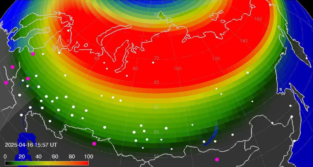 Возмущенным геомагнитное поле Земли будет и завтра. Спад магнитной активности фиксируется к 18 часам 17 апреля. Вероятность сильных магнитных бурь 17 апреля составляет 55%, 18 апреля — 16%.