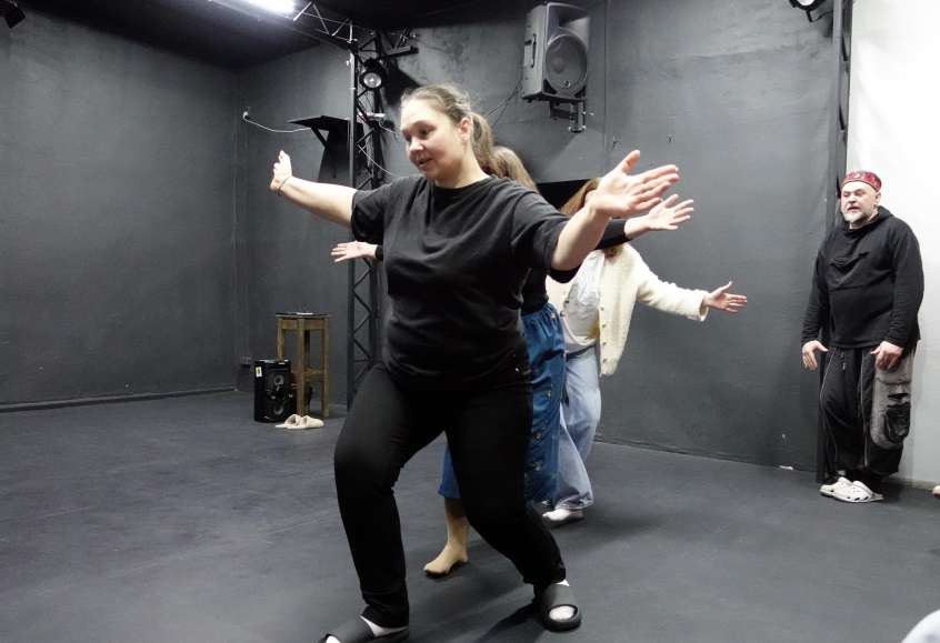 Чем я занималась на мастер-классе? Разглядывала странной формы картонную коробку, давая ей характеристики. Здоровалась только глазами и жестами с незнакомыми мне людьми, как будто мы не виделись много лет. «Раздувалась» с целью захватить мир, и после «сжималась», «превращалась» в молекулу. Еще я на время «становилась» неким бытовым прибором, например, соковыжималкой, и «общалась» с другим подобным мне «бытовым прибором». «Говорила» с воображаемой птицей (свистеть запретили). По моим ощущениям, напрочь завалила задачу рассказать сказку о Красной шапочке используя звуки «ЖЖЖ» и «РРР», при этом не интонируя знакомый текст. Часто роль зависела от музыкальной темы, которую предлагал Макс Галицкий, музыка диктовала настроение и меняла картинку и темп.