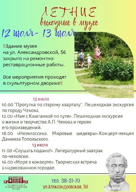 В субботу и воскресенье вы сможете посетить увлекательные программы в скульптурном дворике, побывать на пешеходных экскурсиях — пройтись по исторической части города.
