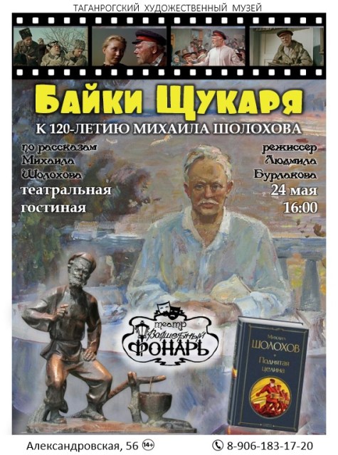 «Приглашаем отпраздновать 120-летие со дня рождения Михаила Александровича Шолохова в театральной гостиной на веселом представлении «Байки Щукаря» таганрогского Народного театра «Волшебный фонарь», — предлагает ТХМ.