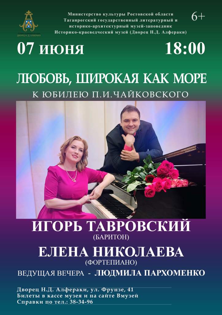 7 июня во Дворце Алфераки Таганрога пройдет музыкальный вечер «Любовь, широкая как море», посвященный 185-летию со дня рождения великого русского композитора Петра Ильича Чайковского.