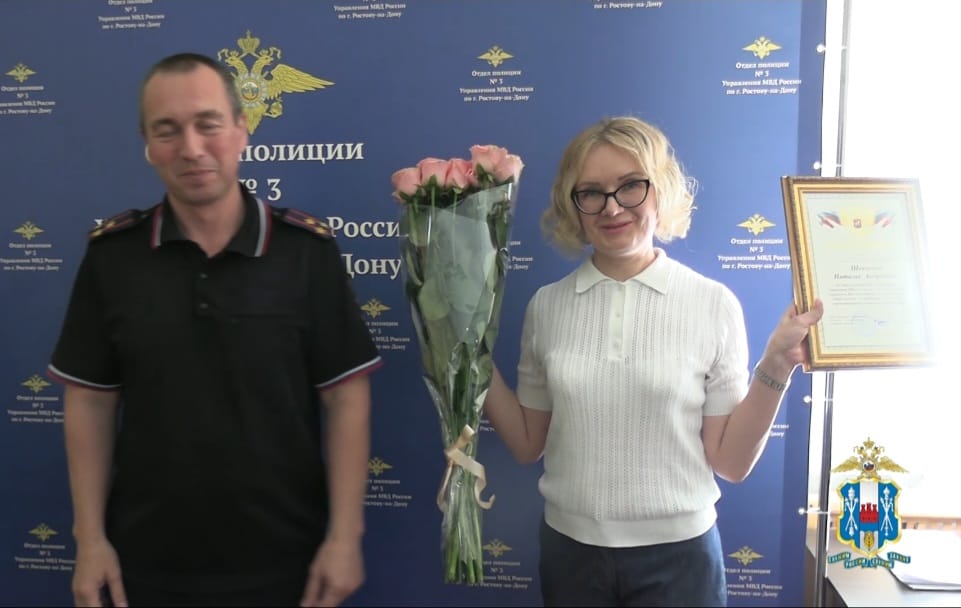 «За проявленную внимательность и неравнодушие руководитель территориального отдела полиции полковник Сергей Шепелев в торжественной обстановке вручили банковскому специалисту Наталье Шевченко благодарственное письмо», — сообщает пресс-служба ГУ МВД России по Ростовской области.