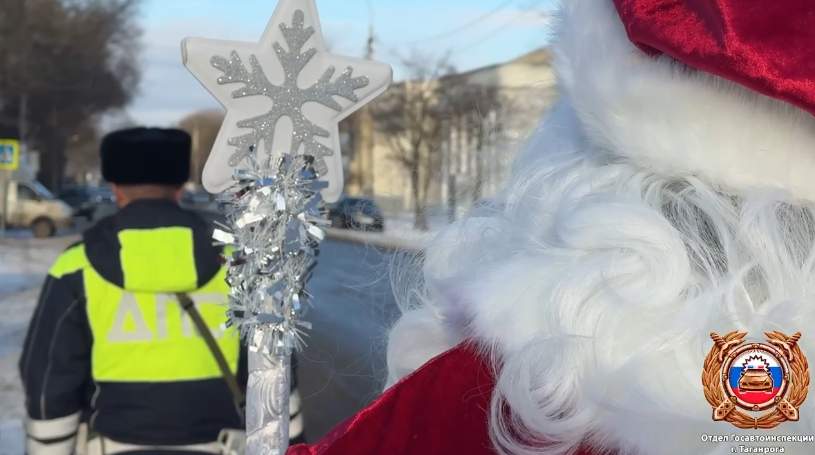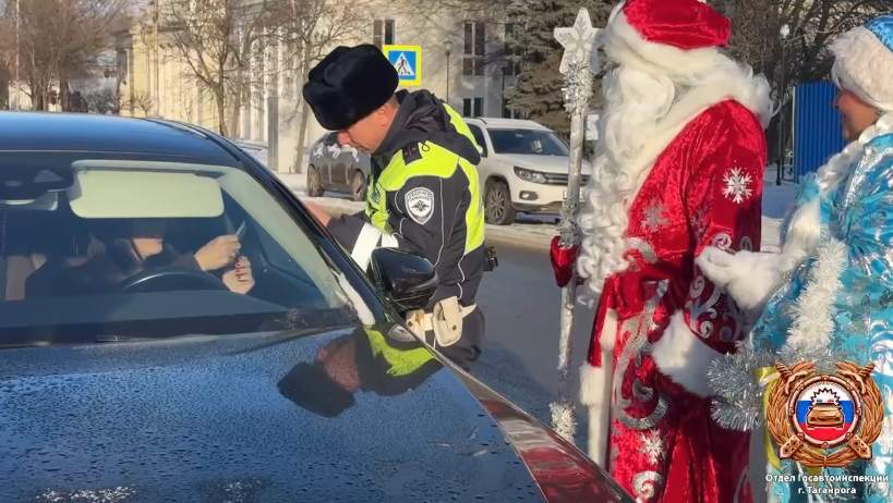 В Таганроге полицейские провели необычную акцию — накануне новогодних выходных сотрудники Госавтоинспекции вместе с Дедом Морозом и Снегурочкой вышли на оживленные городские магистрали, чтобы поздравить автомобилистов и пешеходов с наступающими праздниками.