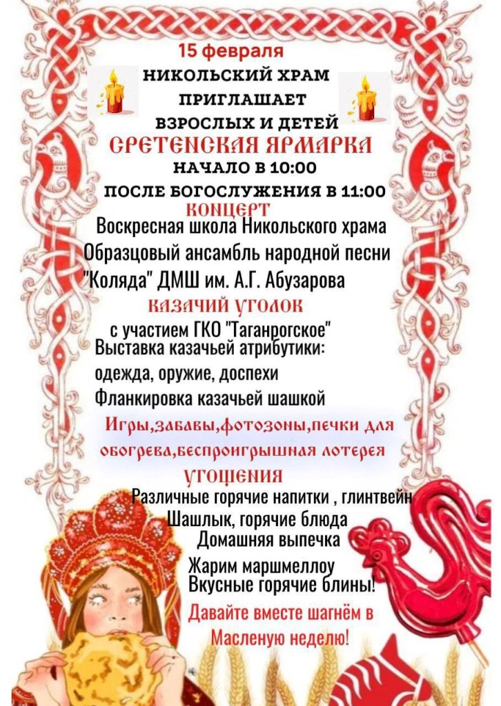 15 февраля во дворе Никольского храма Таганрога (ул. Шевченко, 28) после Божественной литургии пройдет Сретенская ярмарка.