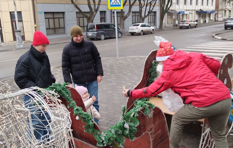 Традиционный подарок городу к Новому году сделал таганрожец Олег Фетисов. Верхние ветви новогоднего дерева он украсил с помощью стремянки, после чего переоделся в Деда Мороза и стал раздавать проходившим мимо детишкам подарки.