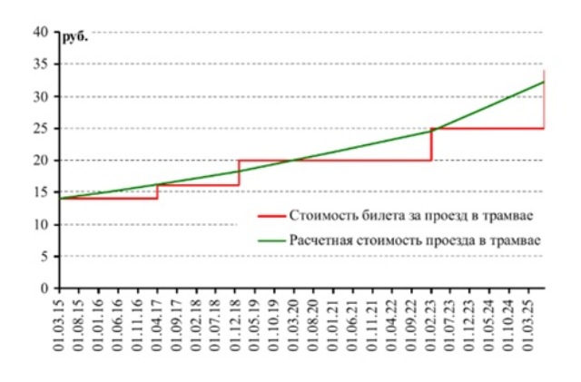 Давайте посмотрим на рисунок 1. На нем красной линией отражен тариф за проезд в автобусах, действующий в Таганроге за последние 10 лет. Если взять за базис стоимость проезда в 2015 году (16 рублей) и проиндексировать ее в соответствии с темпом инфляции, в том числе учитывая индексы стоимости топлива и запчастей (зеленая линия), то увидим достаточно сильную корреляцию между графиками.