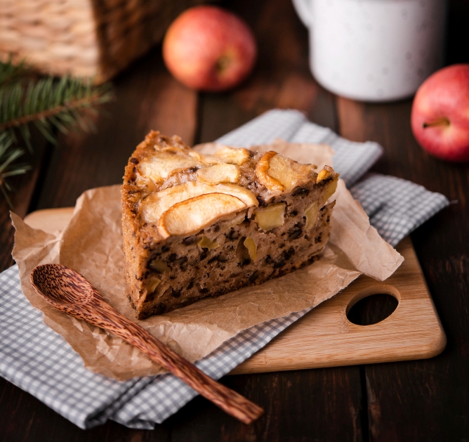 Наша яблочная коврижка готова! Изюм и орехи делают ее сытной, корица придает особую вкусовую нотку, а медовая заправка – нежность и сладость. Можно заваривать ароматный чай и устраивать душевные посиделки с друзьями!