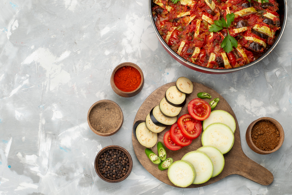Овощи вымоем и обсушим. Кабачки и помидоры нарежем кружочками средней толщины. С баклажанами поступим также, только не забудем потом присолить и оставить так минут на 15-20, чтобы вышла лишняя горечь, и после промыть холодной водой. У перцев вырезаем сердцевину и тоже нарезаем их кружками.