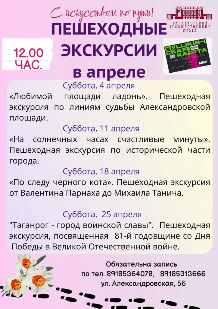 Пока оба корпуса ТХМ закрыты для проведения ремонтно-реставрационных работ, коллектив художественного музея предлагает другие формы музейных мероприятий. Пешеходные экскурсии по историческому центру Таганрога пользуются большой популярностью у жителей и гостей города. Продолжатся они и в апреле.