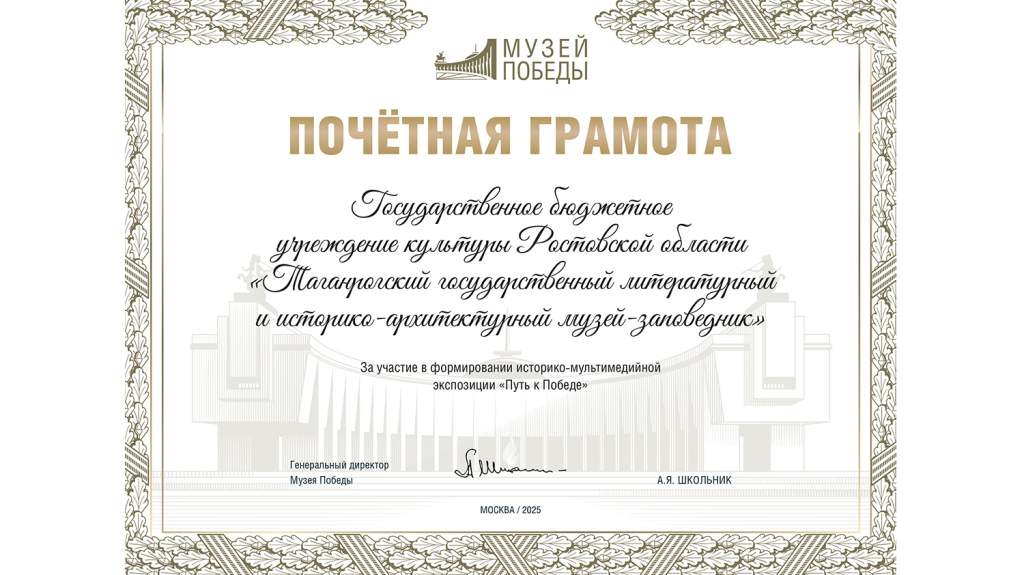 Почетная грамота Центрального музея Великой Отечественной войны (Музея Победы) в Москве вручена Таганрогскому музею-заповеднику (ТГЛИАМЗ) за участие в формировании экспозиции «Путь к Победе». Об этом рассказали в пресс-службе ТГЛИАМЗ.