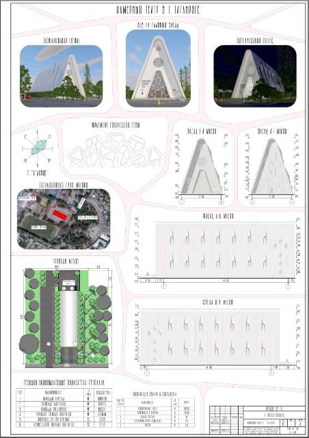 Здание в проекте ориентировано таким образом, что центральная аллея сквера им. А.П. Чехова, ведет к главному входу в театр, а основная ось города (ул. Чехова) проходит через здание. В дипломе учтены и планировка участка, и его благоустройство, рассчитано место для парковки.