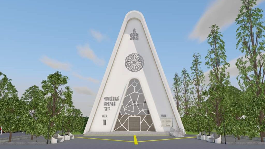 Здание театра автор увидел в виде треугольной прямой призмы, основание которой представляет из себя равнобедренный треугольник. Упрощенный и адаптированный под современное виденье фасад отсылает нас к элементам готического стиля, о нем напоминают и боковые стороны будущего храма для искусства. На части здания, обращенной в будущий двор театральной постройки, — окна разных размеров, выстроенные неровным узором. В проекте театр представлен в белом цвете, а украшают его зеркальные хромированные панели.