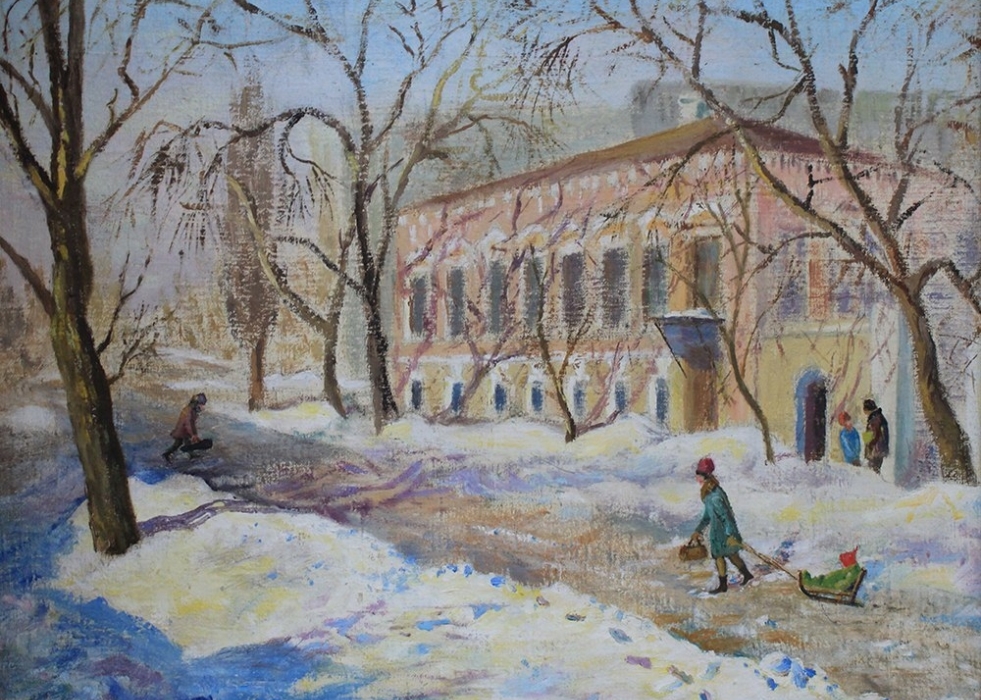 В Таганроге зимний пейзаж, запечатленный на картине советского времени, почти не изменился спустя десятилетия. Полотно С.А. Песочиной «Зимний день в Таганроге», созданное еще в 1970-е годы, изображает уголок улицы, которая тогда носила название III Интернационала. На картине можно увидеть здание, где в тот период располагалась детская музыкальная школа №1 имени П.И. Чайковского.