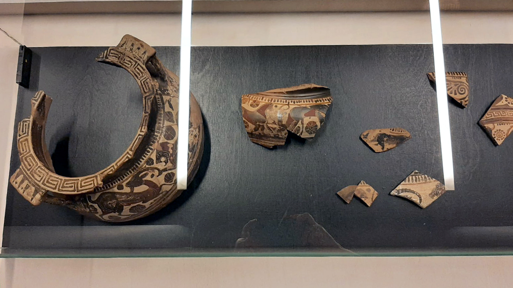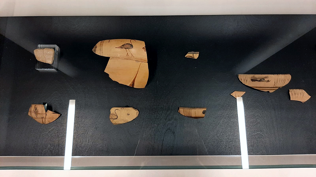 Помимо киликов конца VII-VI веков до н.э., на выставке представлен остракон – фрагмент амфоры с текстом симпозиального тоста на ионийском диалекте, опубликованный Юрием Виноградовым и найденный в 1989 году. Интересно, что античное название Таганрогского поселения до сих пор остается загадкой для исследователей. Большинство российских ученых склоняются к версии, что это могли быть Кремны, упомянутые Геродотом как поселение на берегу Меотийского озера (Азовского моря), однако точная локазация этого древнего города продолжает оставаться предметом научных дискуссий.