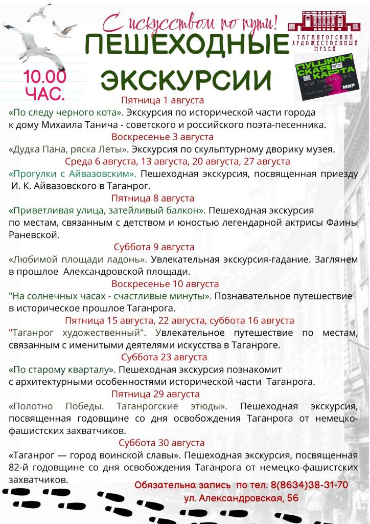 По пятницам, 15 августа и 22 августа, а также в субботу, 16 августа: «Таганрог художественный» — увлекательное путешествие по местам, связанным с именитыми деятелями искусства в Таганроге.