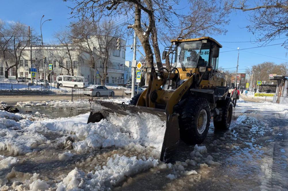 Параллельно для очистки улицы от воды и наледи трудятся дорожные рабочие, в их распоряжении два самосвала, экскаватор и три фронтальных погрузчика.