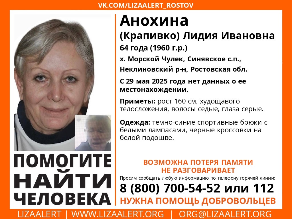 Под Таганрогом, в хуторе Морской Чулек Синявского сельского поселения пропала 64-летняя Лидия Ивановна Анохина (Крапивко). Об этом сообщает поисковый отряд «ЛизаАлерт».