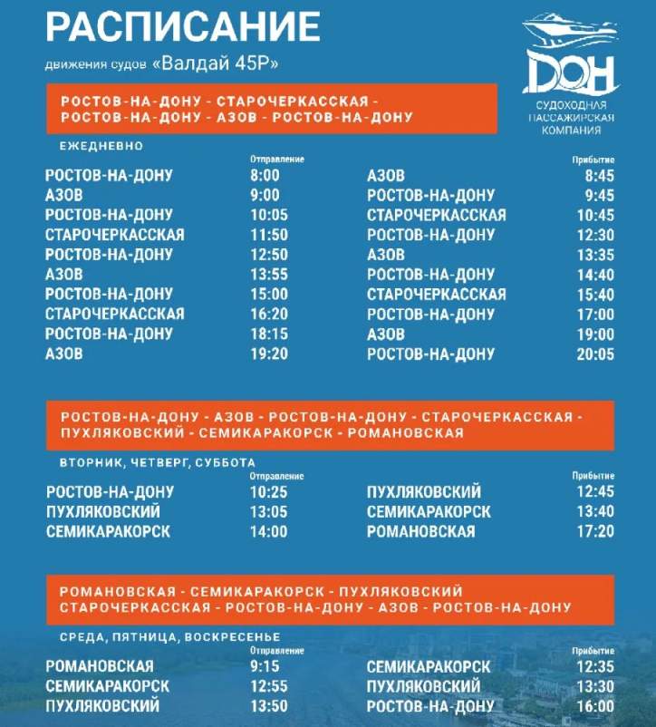 Что касается станицы Романовской, то туда судна будут по-прежнему перевозить пассажиров трижды в неделю — во вторник, четверг и субботу. А обратно в Ростов-на-Дону — в среду, пятницу и воскресенье.