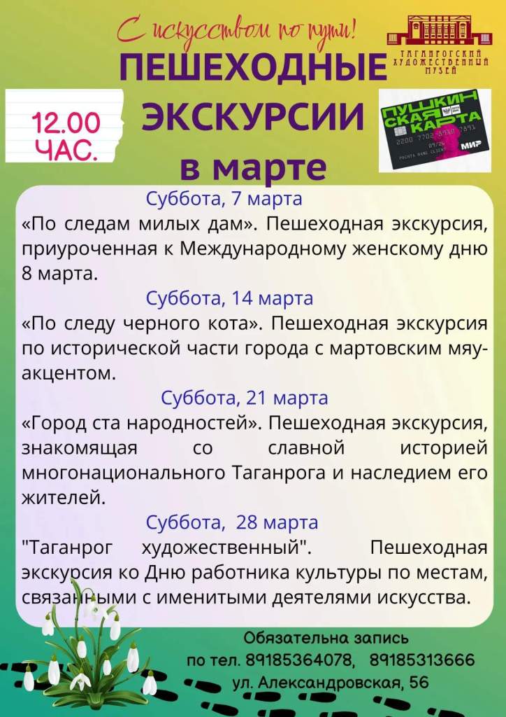 Пешеходные экскурсии по историческому центру Таганрога ТХМ продолжит в течение марта. Увлекательные путешествия стартуют каждую субботу в 12.00 по адресу: улица Александровская, 56. Телефоны для записи: 8 (918) 53-64-078, 8 (918) 531-36-66.