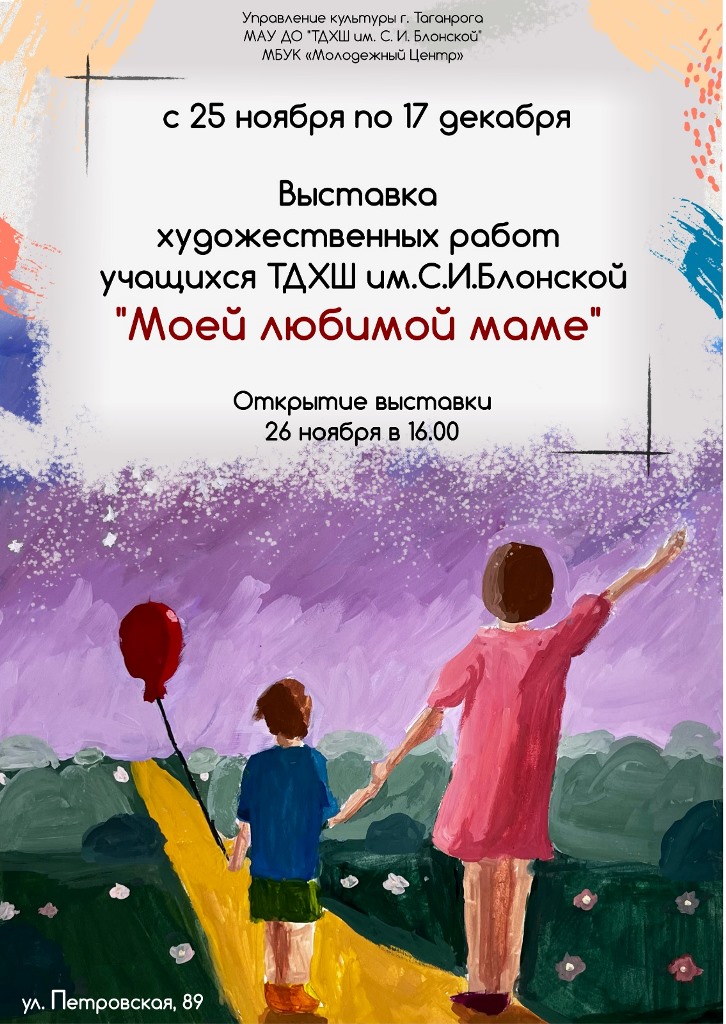 В преддверии Дня матери Таганрогская детская художественная школа им. С.И. Блонской в помещении Молодежного Центра (ул. Петровская, 89) представляет яркую и трогательную выставку работ учащихся школы «Моей любимой маме».