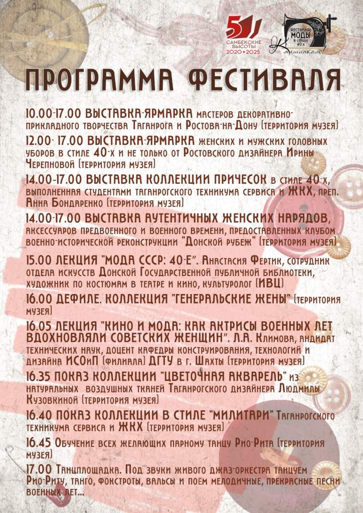 30 августа, в день освобождения Таганрога и Ростовской области от фашистской оккупации, в музее «Самбекские высоты» пройдет открытый фестиваль моды в стиле 40-х «К машинкам!». Мероприятие приурочено к 80-летию Великой Победы и 80-летию с момента первого после войны модного показа.