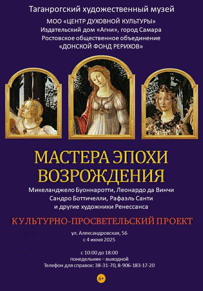 4 июня в Таганрогском художественном музее откроется тематическая выставка «Мастера Эпохи Возрождения». Культурно-просветительский проект познакомит зрителей с творчеством великих художников итальянского Ренессанса XV–XVI веков – эпохой, когда происходило настоящее возрождение всех видов искусства.