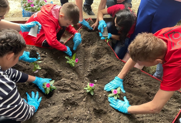 Участников мероприятия объединил мастер-класс «Звезда Победы». Совместное оформление клумбы в форме звезды, активное участие ребят в посадке и поливке растений доставило море положительных эмоций всем участникам.