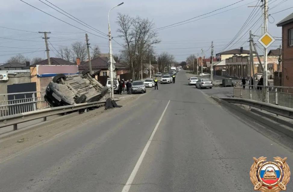 Происшествие случилось в три часа дня в Батайске. По предварительной информации, 67-летний водитель автомобиля Toyota RAV4, выезжая с второстепенной дороги, не уступил путь машине Hyundai ix35, которая следовала по главной. От удара Hyundai через барьерное ограждение вылетел на пешеходную дорожку и перевернулся.