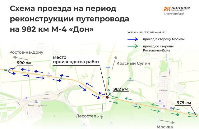 «Для въезда в Красный Сулин с южного направления необходимо развернуться на 977 км М-4. Для выезда из Красного Сулина в северном направлении необходимо использовать разворот на 987 км М-4», — уточнили в «Автодоре».