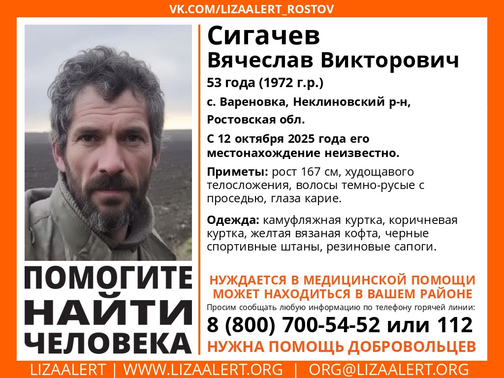 В селе Вареновка Неклиновского района пропал 53-летний Вячеслав Викторович Сигачев, который может нуждаться в медицинской помощи, сообщает поисковый отряд «ЛизаАлерт».