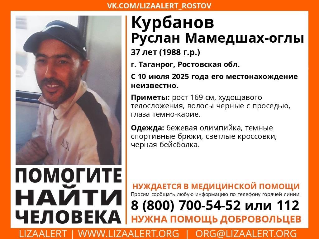 В Таганроге пропал 37-летний Курбанов Руслан Мамедшах-оглы. Мужчина может нуждаться в медицинской помощи, сообщает на своей страничке ВК поисковый отряд «Лиза Алерт».