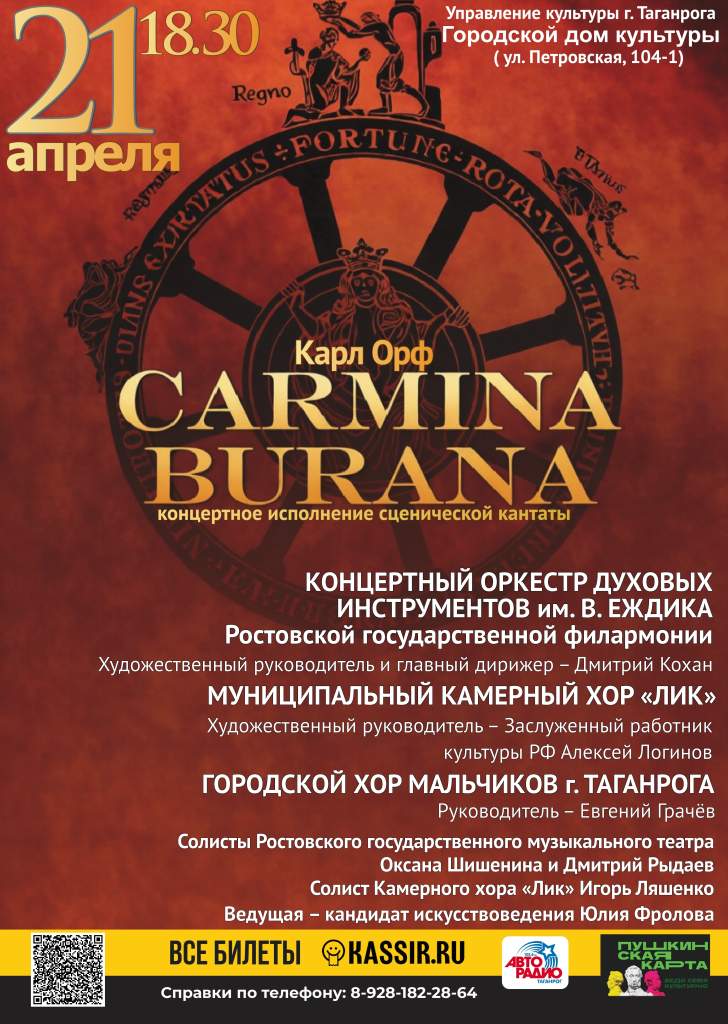 В Таганроге прозвучит знаменитая кантата Карла Орфа «Кармина Бурана» — одно из самых узнаваемых и мистических произведений прошлого столетия. Концерт состоится 21 апреля на сцене Городского дома культуры.